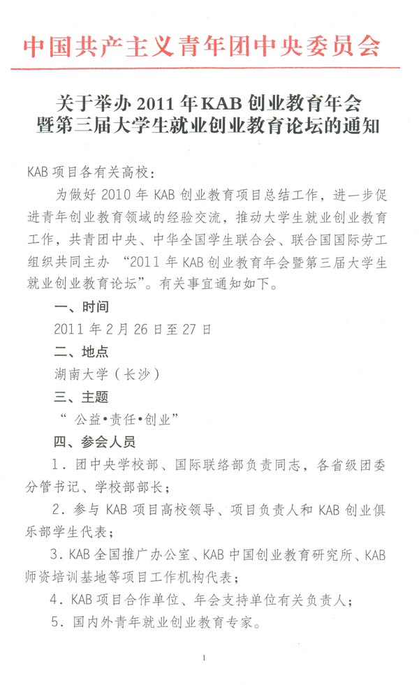 为做好2010年KAB创业教育项目总结工作,进一步促进青年创业教育领域的经验交流,推动大学生就业创业教育工作,共青团中央、中华全国学生联合会、联合国国际劳工组织共同主办 “2011年KAB创业教育年会暨第三届大学生就业创业教育论坛”。有关事宜通知如下。