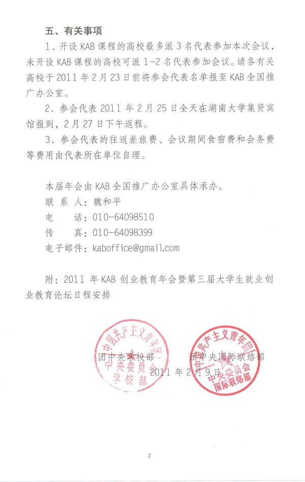 1.开设KAB课程的高校最多派3名代表参加本次会议,未开设KAB课程的高校可派1-2名代表参加会议。请各有关高校于2011年2月23日前将参会代表名单报至KAB全国推广办公室。